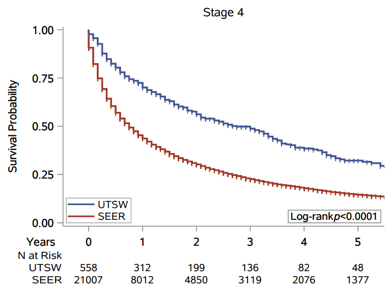 Survival statistics for kidney cancer patients at UTSW determined by SEER database.