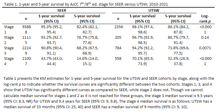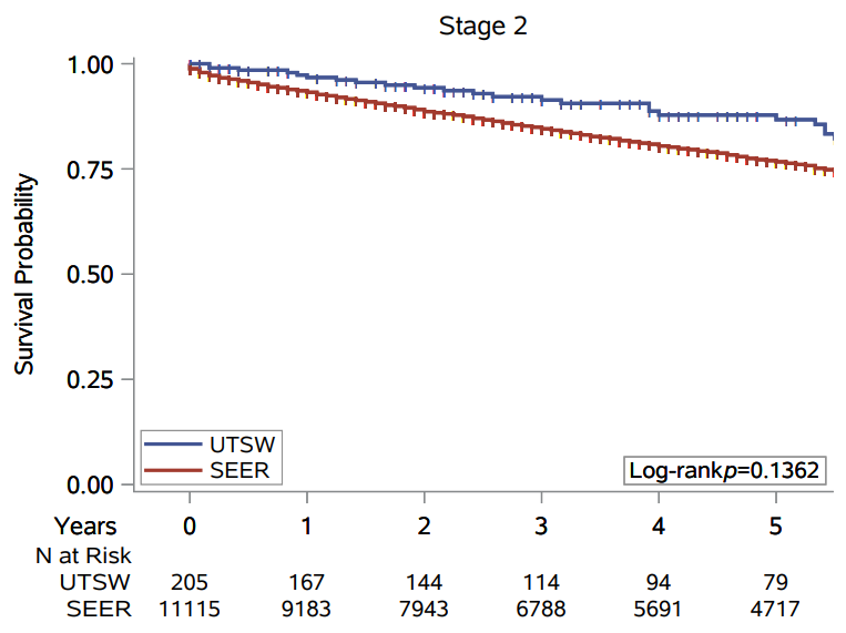 Survival statistics for kidney cancer patients at UTSW determined by SEER database.